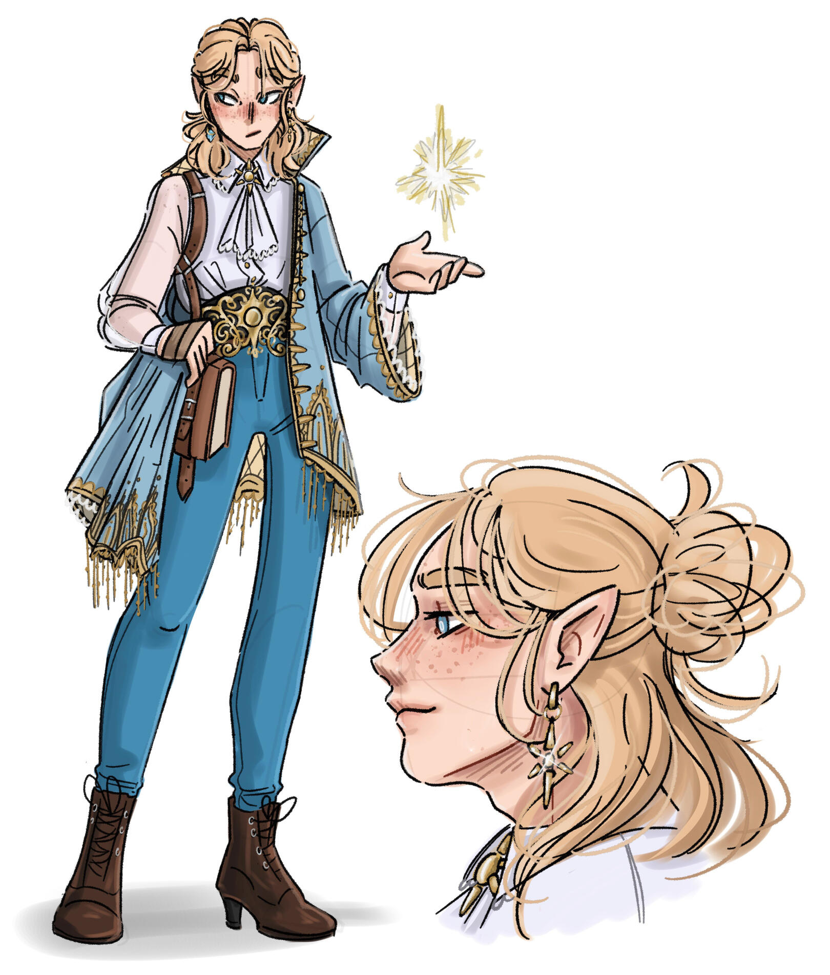 Kalceran Castelet was, by all means, a surprise and a miracle to his parents, the King and Queen of the Bright Capital, who weren’t certain they’d ever be able to concieve together. As he was the true-born son to the king, Kalceran became the crown prince, next in line for the throne.His older brother, Lorién, was not the natural-born son to his father, being the bastard son of his mother’s past relationship. While both were treated as equal and doted on extensively from their parents, resentment began to grow in the older sibling, who treated the younger with resentment and hatred even from when they were little. Then, on the day of Kalceran’s 7th birthday, he snapped and attacked the young crown prince.By the grace of the goddess, the high priest of the Sun Temple was able to save Kal’s life with a Revivify spell. For less than a minute, Kalceran had been deceased: an event that had changed the bright and happy boy into an anxious, quiet, paranoid child.His brother was sent away in the wake of the incident, and his parents became strict, rarely allowing the young prince the freedom to leave the castle’s walls, or even go many places within the palace without some sort of supervision. He threw himself into books to chase away his boredom and cope with what had happened to him.Following the events of the campaign, he met the party completely by accident after sneaking away from the castle to experience the thrills of the city's annual Bright Festival, only to be swept up in the chaos as the plush prizes of the carnival games came to life and began attacking the locals. Since then, Kal has been practically inseparable from the group, particularly Leocoril, the half-elf boy of which he's grown incredibly fond for, that of whom he has shared traumas with.